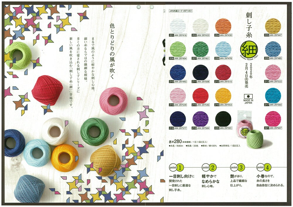 ◯品質構成:綿100% ◯糸長:約80m ◯色数:全20色各1玉 ●関連商品 1玉単位の購入は ⇒ こちら 関連項目:オリンパス 日本に古くから伝わる伝統的な 刺しゅう 刺繍