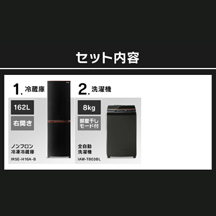 ■セット内容全自動洗濯機 8.0kg IAW-T803BL ブラックノンフロン冷凍冷蔵庫 162L IRSE-H16A-B ブラック【全自動洗濯機 8.0kg IAW-T803BL ブラック】(アイリスオーヤマ)■種類:全自動洗濯機■商品サイズ(cm):幅約59.0×奥行約59.1×高さ約93.0■質量:約36kg■定格電圧:AC 100V■定格電源周波数:50Hz/60Hz■定格消費電力:50Hz:460W、60Hz:500W■標準洗濯容量:8.0kg■標準脱水容量:8.0kg■標準使用水量:158L■標準水量:58L■所要時間(標準):56分■運転音:洗濯:約39dB、脱水:約54dB■防水レベル:IPX4■排水ホース:右側の場合:約80cm、左側の場合:約40cm■電源コード:約1.9m■付属品:給水ホース約80cm(給水ナット、継手付き)【ノンフロン冷凍冷蔵庫 162L IRSE-H16A-B ブラック】(アイリスオーヤマ)■種類:ノンフロン冷凍冷蔵庫■冷媒:R600a■ドア数:2■商品サイズ(cm):幅約47.4×奥行約53.5×高さ約149.6■質量:約40kg■定格電圧(定格周波数):AC100V(50Hz/60Hz)■定格内容積※1:全体162L(冷蔵室100L/冷凍室62L)■冷凍室の性能※2記号:フォースター冷凍負荷温度(食品温度):-18℃以下冷凍食品の保存期間の目安:約3か月■定格入力(50Hz/60Hz):68/74W■電熱装置の入力:6W■ドア開閉方向:右■電源コード:約1.8m※1定格内容積は、日本工業規格(JISC9801:2015)にもとづき、食品収納スペースと冷気循環スペースを含んでいます。