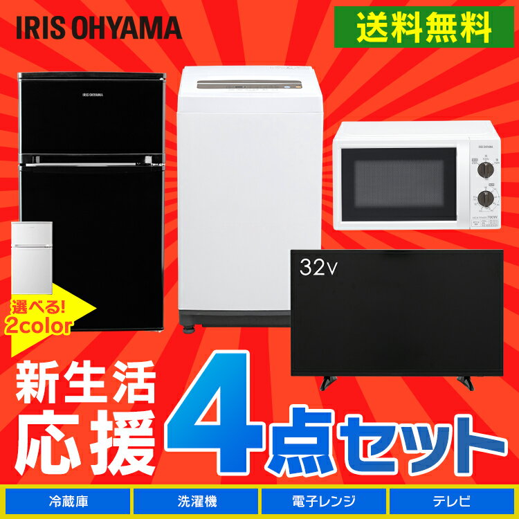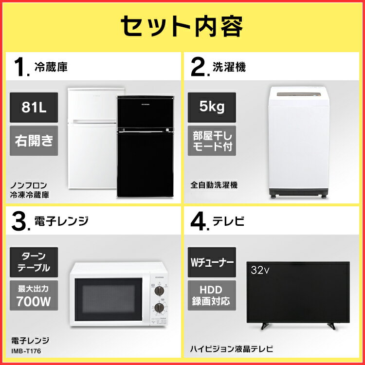 ■省エネ基準達成率:103%■年間消費電力:68kWh/年■付属品:リモコン、リモコン用単4乾電池(テスト用)×2個、miniB-CASカード、miniB-CASカードスロットカバー、miniB-CASカードスロットカバー用ネジ、スタンド×2個、スタンド固定ネジ×2個、取扱説明書、保証書、電源コード<洗濯機>■定格電圧:AC 100V■定格電源周波数:50Hz/60Hz■定格消費電力:50Hz/245W、60Hz/300W■標準洗濯容量:5.0kg■標準脱水容量:5.0kg■標準使用水量:120L■標準水量:46L■防水レベル:IPX4■運転音:洗濯/約36dB、脱水/約51dB■商品サイズ(cm):幅約55.5×奥行約52.5×高さ約92■商品質量:約31kg<ノンフロン冷凍冷蔵庫>■ドア数:2■商品サイズ(cm):幅約48.0×奥行約49.5×高さ約85.0■質量:約25kg■定格電源:AC100V 50Hz/60Hz■定格消費電力:電動機:74W/75W、電熱装置:8W■定格内容積:全体81L、冷凍室57L、冷蔵室24L■冷凍室の性能:冷凍負荷温度(食品温度)-18℃以下、冷凍食品の保存期間の目安約3か月■ドア開閉方向:右開き■電源コード長:1.55m■トップテーブル耐荷重:30kg■トップテーブル耐熱温度:100℃■付属品:製氷皿、霜取り用へら<電子レンジ>■商品サイズ(cm):幅約44.0×奥行約32.5×高さ約25.5■加熱室有効サイズ(cm):幅約30.6×奥行約30.7×高さ約19.0■ターンテーブルサイズ:直径約25.5cm■庫内総容量:約17L■質量:50Hz/約11kg、60Hz/約10.2kg■電源:AC100V(50Hzまたは60Hz専用)■消費電力:1150W■定格高周波出力:強700W、弱500W、解凍200W■発振周波数:2450MHz■タイマー:15分■区分名:A■年間消費電力量:50Hz/59.9kWh、60Hz/59.5kWh■年間待機時消費電力量:0.0kWh■電源コードの長さ:1.5m■材質:鋼板、 ガラス、 ABS樹脂新生活にかかせない家電「テレビ・冷蔵庫・洗濯機・電子レンジ」の4点セットです。