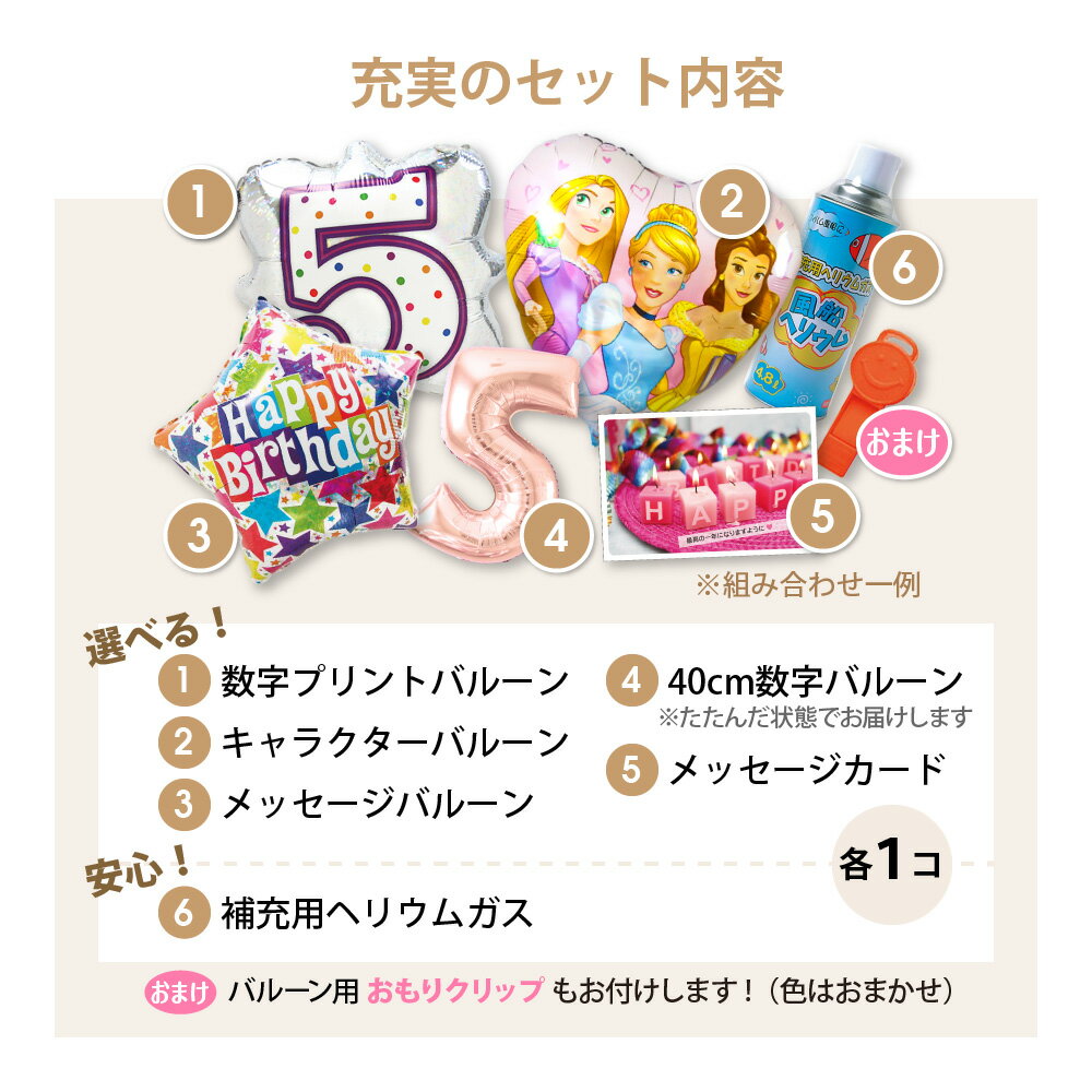 【充実のセット内容】 (1)選べる! 数字プリントバルーン(ガス入り) (2)選べる! キャラクターバルーン(ガス入り) (3)選べる! メッセージバルーン(ガス入り) (4)選べる! 40cm数字バルーン(ガスなし) (5)選べる!メッセージカード (6)安心! 補充用ヘリウムガス缶 (おまけ)バルーン用おもりクリップ 【あらかじめご了承ください】 ・40cm数字バルーンは、空気の入っていないたたんだ状態でお届けします。